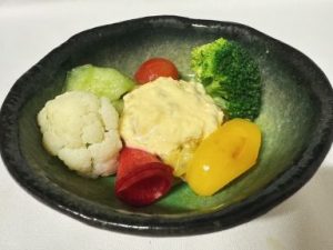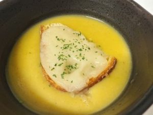 バケットに豆乳クリームをのせて焼きスープの添えてあります